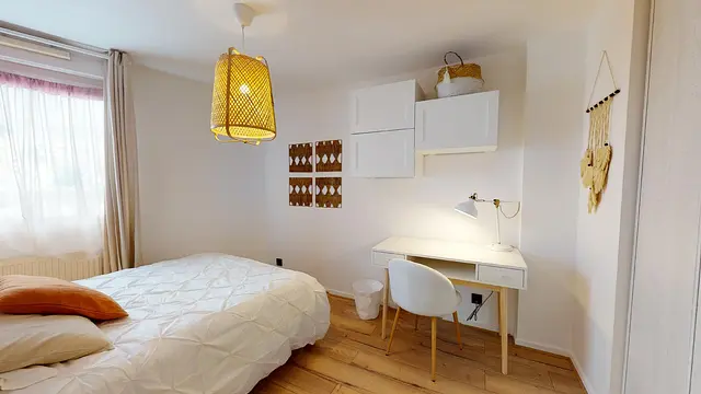 Cette chambre propose également une literie double et un espace bureau fonctionnel. Elle bénéficie d’un agencement fluide, avec des rangements muraux et une décoration sobre et soignée. Les teintes claires et les éléments décoratifs en fibres naturelles renforcent l’ambiance douce et apaisante de la pièce.