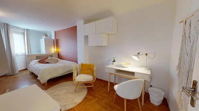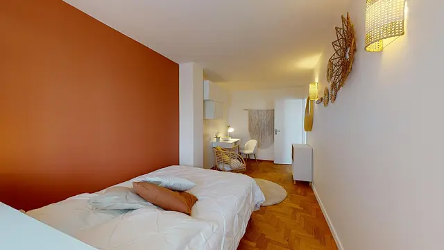 Cette chambre offre un bel espace nuit avec un lit double, un bureau et des rangements. Elle dispose d’une belle luminosité et d’un aménagement équilibré, permettant d’installer facilement un coin travail tout en conservant un espace de circulation confortable. La décoration harmonieuse et le parquet renforcent le caractère chaleureux de la pièce.