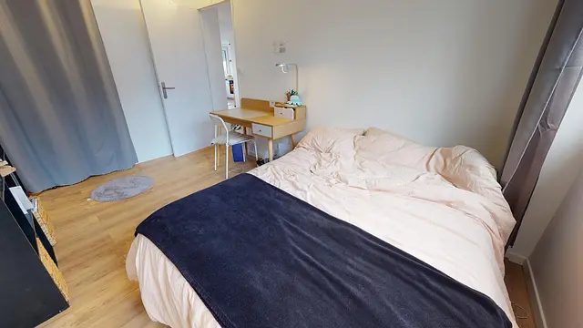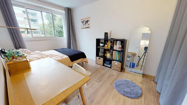 La grande chambre 2 de 12m2 également est très lumineuse grâce à ses grandes fenêtres offre tout le confort nécessaire : lit double, bureau, chaise et placard intégré.