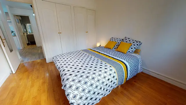 La chambre 1 située à gauche de l’entrée mesure 14m2. Cette chambre comporte un lit double, un bureau, une chaise et un placard de rangement.