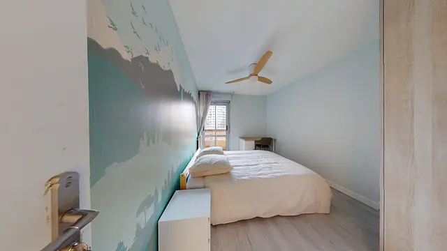 🛏️ La chambre 3 est meublée d’un lit double, d’un bureau avec chaise, d’un placard de rangement, d’une table de chevet et dispose en plus d’un balcon privatif, offrant un espace personnel agréable et lumineux.