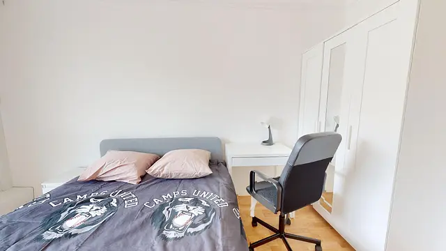 La chambre 2 dispose d'un lit double, d'une armoire de rangement, d'une table basse et d'un bureau accompagné de sa table et de sa chaise.
