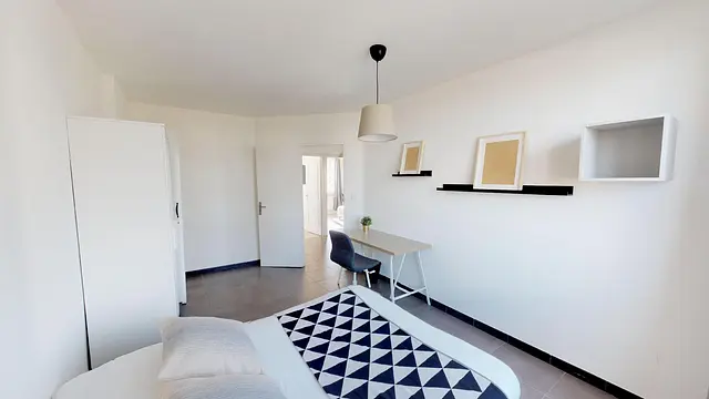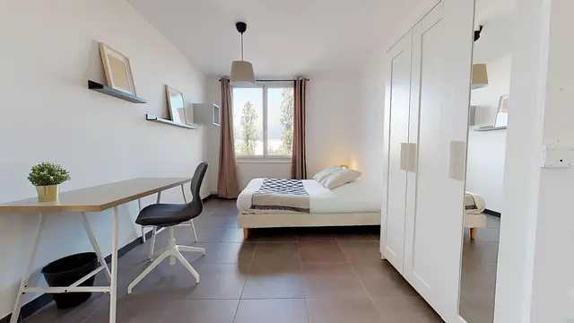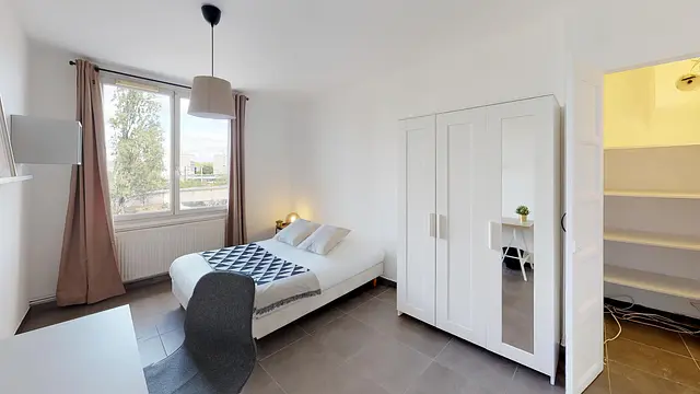 La troisième et dernière chambre de la coloc est isolée des deux autres. Elle est carrelée, dispose d’un lit double, d’une armoire avec porte miroir ainsi que d’un grand placard mural et d’un bureau ! Quelques étagères suspendues permettent de ranger bouquins ou déco. La chambre est sans vis-à-vis.
