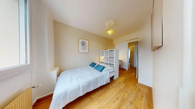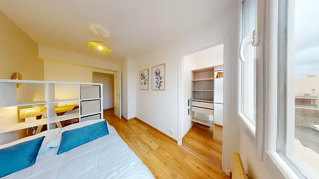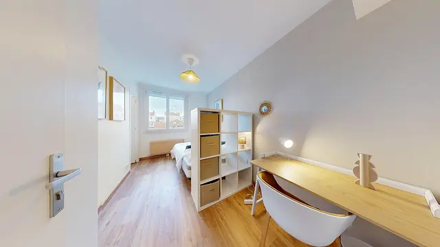 Profitez d'un espace privé de standing, entièrement meublé avec un lit double, un bureau fonctionnel et des rangements intégrés. La décoration moderne et la luminosité en font un véritable cocon, idéal pour se reposer ou travailler au calme.