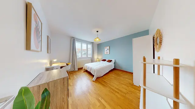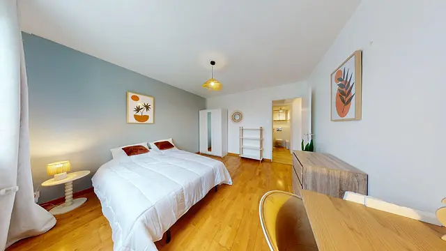 Profitez d'un espace privé de standing, entièrement meublé avec un lit double, un bureau fonctionnel et des rangements intégrés. La décoration moderne et la luminosité en font un véritable cocon, idéal pour se reposer ou travailler au calme.