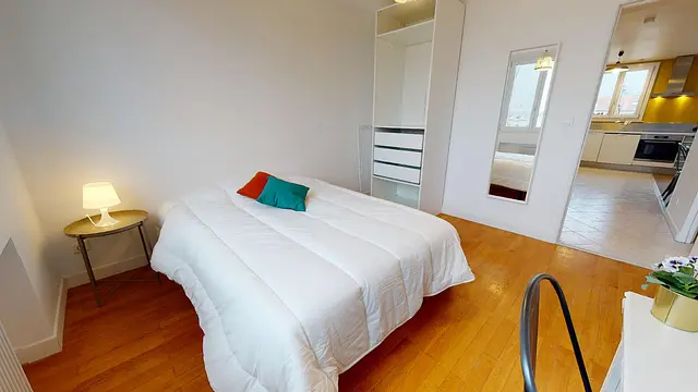 La chambre 2 de 12m2 et lumineuse et offre tout le confort nécessaire. Cette chambre est équipée d’un lit double, d’un bureau, d’une chaise et d’un placard de rangement.