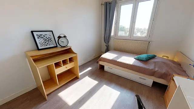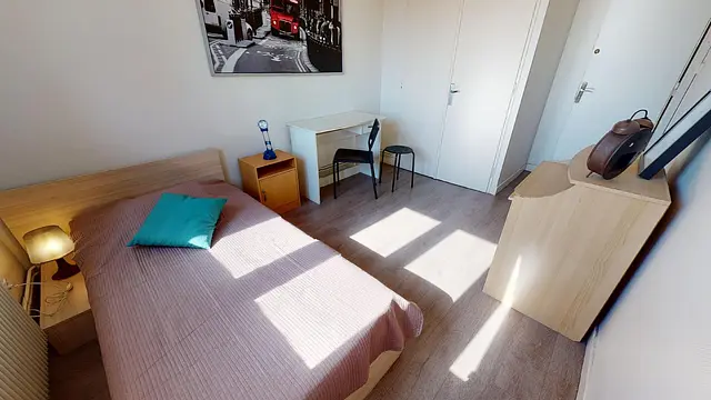 La chambre 2 située au fond du couloir est équipée avec un lit simple (sur le shooting), un bureau, une chaise et des rangements.