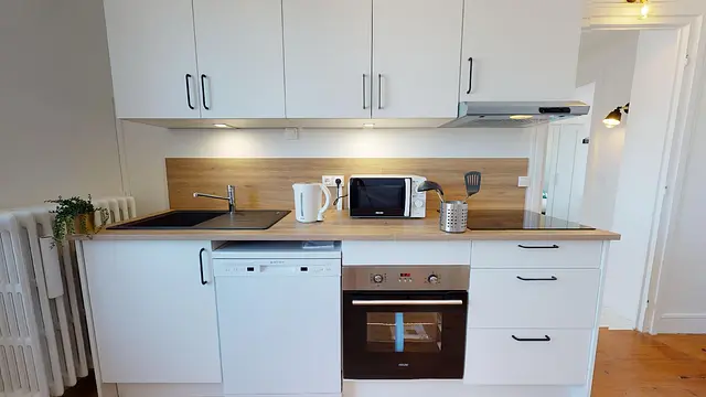 La colocation possède une belle pièce de vie avec espace salon et une cuisine ouverte. L'espace salon est meublé avec : canapé, fauteuil et table basse et table à manger. La cuisine ouverte est idéalement équipée avec machine à laver, four, plaque de cuisson, micro ondes et de nombreux rangements.