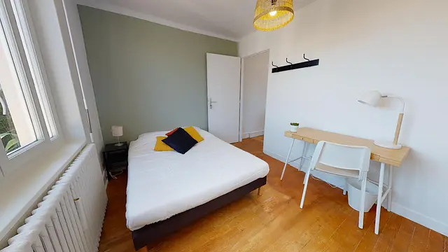 La troisième chambre de cette colocation est équipée avec un grand placard de rangement, un lit double et un bureau.