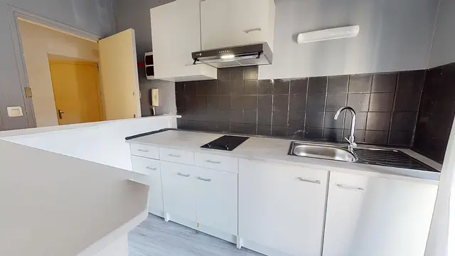 Cet appartement comporte une pièce de vie aménagé avec un espace cuisine équipée de plaques de cuisson, de rangements, d'une hotte et d'un évier.