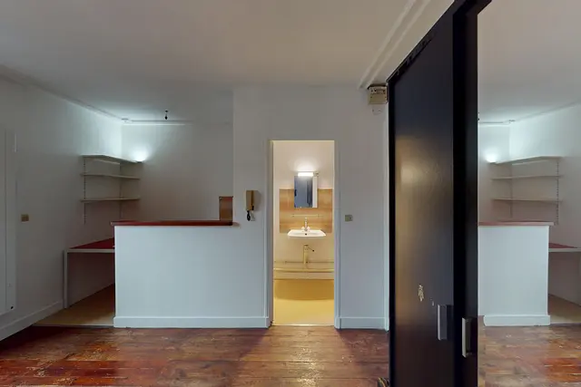Dès l'entrée, vous serez séduit par le magnifique parquet d'origine qui apporte une atmosphère chaleureuse et authentique à la pièce de vie. Le studio est intelligemment agencé pour maximiser chaque mètre carré :