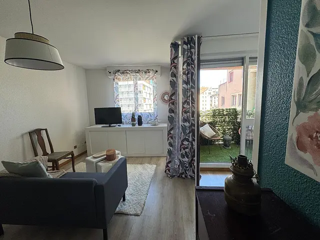 Cet espace s'ouvre sur une cuisine fonctionnelle entièrement équipée avec four, micro-ondes, plaques de cuisson et réfrigérateur, organisée pour simplifier votre quotidien. Le salon donne un accès direct à un balcon privatif aménagé (gazon synthétique, fauteuils relax), idéal pour profiter des journées ensoleillées avec une vue dégagée.
