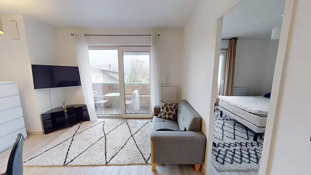 La pièce de vie est meublée avec un canapé, une télévision, une commode et une table à manger, idéale pour vos moments conviviaux. Elle donne accès au balcon pour profiter de l’extérieur.
