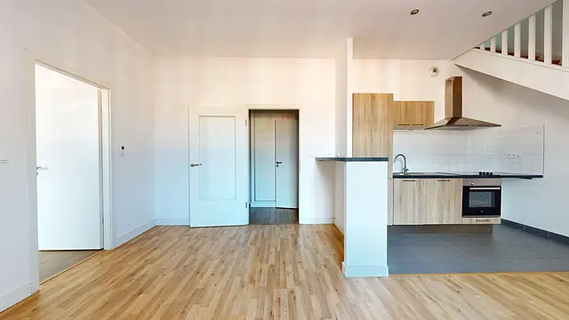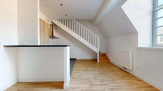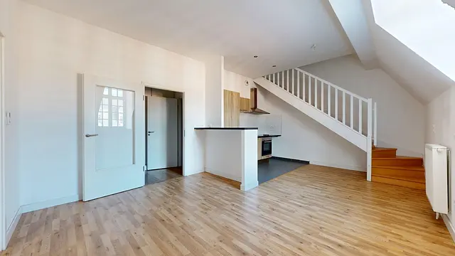 Côté nuit, l’appartement propose deux chambres. La première se situe au niveau principal et bénéficie d’un beau volume avec parquet et fenêtre apportant une lumière naturelle agréable. La seconde chambre, située à l’étage, offre un espace mansardé chaleureux, idéal pour une chambre ou un bureau, avec parquet et éclairage naturel via un velux.
