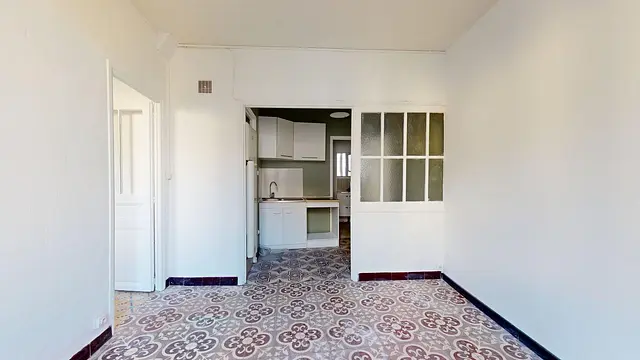 L’appartement se compose d’un séjour lumineux au sol en carreaux anciens, qui apporte du caractère à la pièce. La cuisine attenante est équipée de plaques de cuisson, d’un évier avec meuble de rangement et d’un réfrigérateur.