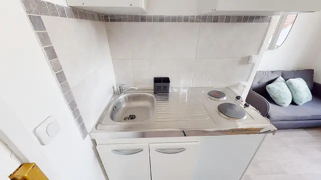 L’appartement dispose d’une kitchenette (frigo, 2 plaques de cuisson, meubles de rangements), d’une salle de douche avec les toilettes, d’un canapé-lit convertible, d’un meuble tv, d’une télévision et d’un grand miroir.