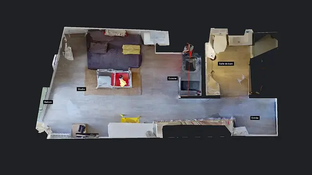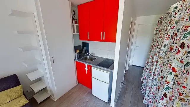 Le studio se compose d’une pièce de vie équipée avec une kitchenette avec frigo, plaque de cuisson et rangements, et d’un espace salon/chambre.