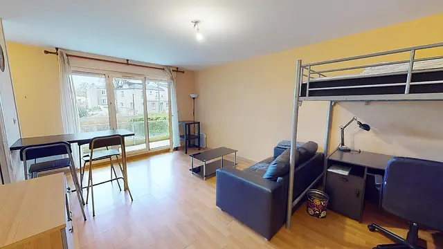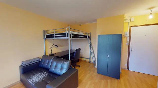 Ce T1 s'ouvre sur une pièce de vie meublée : un lit mezzanine avec un coin bureau en dessous.
