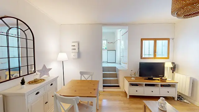 Dès l’entrée, vous découvrez une pièce de vie décorée avec soin, comprenant une commode, une table à manger pour deux personnes avec ses 2 chaises ainsi qu’un espace salon aménagé avec un canapé, une table basse, un meuble télé et une télévision. Deux beaux miroirs et un lampadaire viennent compléter l’ensemble et apportent une atmosphère chaleureuse et cosy.