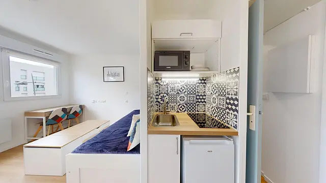Ce studio fonctionnel et lumineux s’ouvre sur une pièce de vie équipée d’un canapé-lit, d’une table basse, d’un bureau avec deux chaises colorées et de rangements.