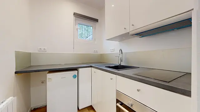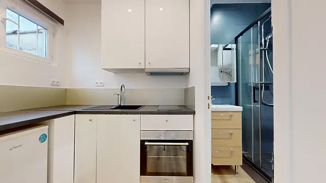 L'appartement est composé d'une pièce de vie, équipée, d'une table haute et d'un placard de rangements. La cuisine indépendante est équipée d'un réfrigérateur, d'un four, de plaques de cuisson, d'une hotte et d'un évier. Par la cuisine, vous accèderez également à la salle de bain fraîchement rénovée, équipée d'une cabine de douche, d'un meuble vasque et de toilettes.