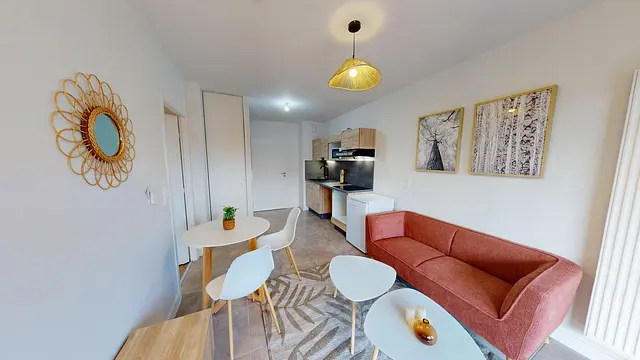 Cet appartement dispose d'une pièce de vie lumineuse et bien agencée. L’espace séjour s’ouvre sur un coin salon aménagé et un espace repas, le tout dans une ambiance contemporaine aux tons clairs et chaleureux. La cuisine, ouverte sur le séjour, est équipée de rangements modernes, d’une plaque de cuisson, d’un micro-ondes et d’un réfrigérateur, avec un plan de travail fonctionnel et des finitions soignées. Deux emplacements prévus permettent l’installation d’un four, d’un lave-vaisselle ou d’un lave-linge