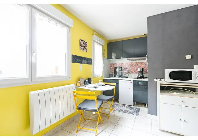 L’espace de vie s’organise autour d’une kitchenette équipée comprenant un évier, des rangements, un micro-ondes, une hotte, des plaques de cuisson, ainsi que les indispensables du quotidien : ustensiles de cuisine, machine à café et petit réfrigérateur.