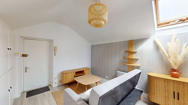 L’entrée s’ouvre sur une pièce de vie lumineuse, aménagée avec soin : un canapé, une table basse, des rangements en bois naturel et un coin repas avec un bar mange-debout et chaises de bar, permettant de séparer l'espace de vie de la cuisine. Une grande fenêtre de toit laisse entrer la lumière. Vous disposerez de plusieurs rangements astucieux.