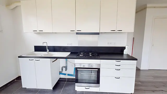 RDC: Le logement s'ouvre sur une belle pièce de vie avec cuisine ouverte, équipée avec four, plaques de cuisson et hotte. Vous aurez accès à un petit balcon donnant une vie dégagée sur l'extérieur.