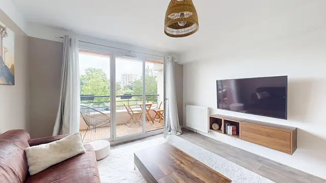 La pièce de vie, lumineuse et chaleureuse, est aménagée avec un canapé, une table basse, une télévision et un meuble TV. Elle donne un accès direct au balcon, idéal pour profiter de l’extérieur, avec ses petits meubles de décoration.