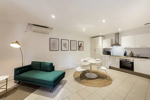 Cet appartement lumineux comprend une pièce de vie aménagée avec un canapé, une table basse, une TV, une commode, etc et une cuisine ouverte.