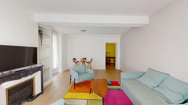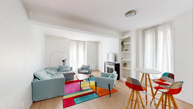 Ce T2 dispose d'une grande pièce de vie lumineuse aménagée d'un canapé d'angle, de deux fauteuils, d'une table basse, d'une table haute avec trois chaises, d'une bibliothèque et d'un placard mural ainsi que d'une cheminée décorative avec une télévision.
