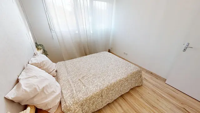 Cet appartement comporte donc une chambre équipée avec un lit double et un placard de rangement intégré et une pièce bureau composé d'un bureau, d'une chaise et d'une corbeille.