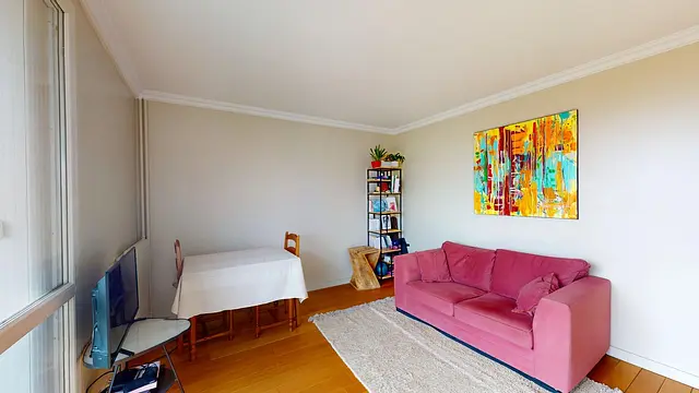 L’espace de vie s’organise autour d’un salon lumineux, meublé avec goût, comprenant un canapé, une table à manger et une TV. Il s’ouvre sur une large baie vitrée donnant accès à un balcon aménagé avec plantes et mobilier d’extérieur, offrant une agréable vue dégagée sur la ville.