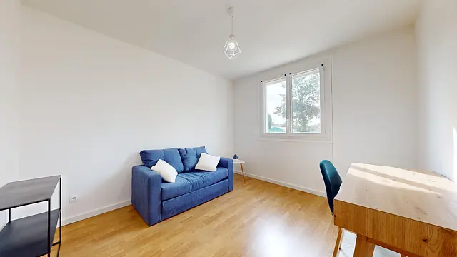 Le salon est aménagé d'un canapé, des tables basses gigognes, un buffet, un meuble de rangement ainsi qu'une table avec quatre chaises.