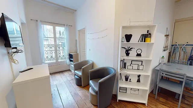- une seconde pièce aménagée avec un canapé convertible et des rangement (penderie, placard et commode). Cette pièce peut être une chambre, un bureau ou un salon.