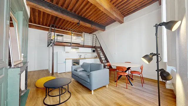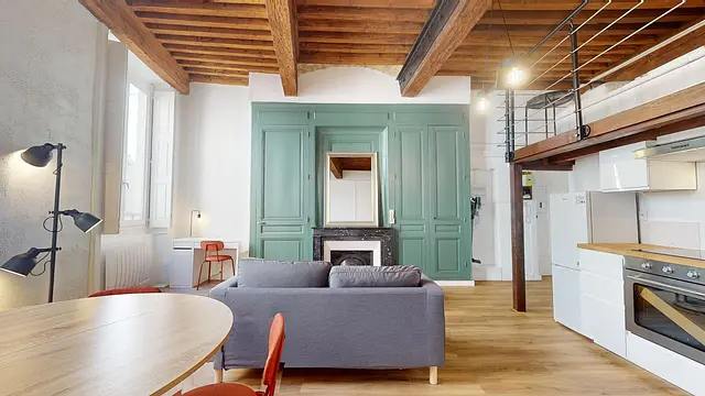 Cet appartement typiquement lyonnais s'ouvre sur une spacieuse pièce de vie avec cuisine ouverte. Celle-ci dispose d'un canapé, d'une table basse, d'un bureau et d'une table avec 4 chaises.