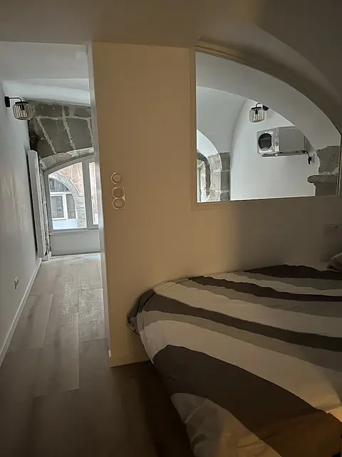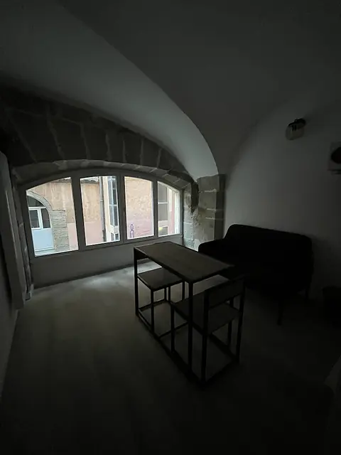 Ce studio avec ses pierres apparentes offre tout le confort nécessaire. Il est aménagé avec un espace de vie avec canapé, table à manger, chaise et cuisine ouverte.