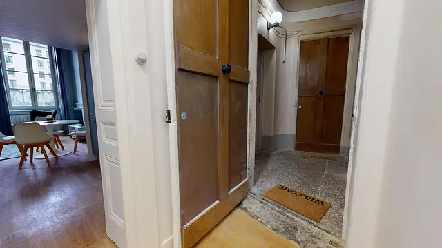 Typique des appartements canuts avec une belle hauteur sous plafond et poutres apparentes, il bénéficie d’une belle lumière et d’un coin nuit aménagé en mezzanine. On y trouve un grand placard, un lit double, deux tables de nuit et une hauteur suffisant pour se tenir debout.
