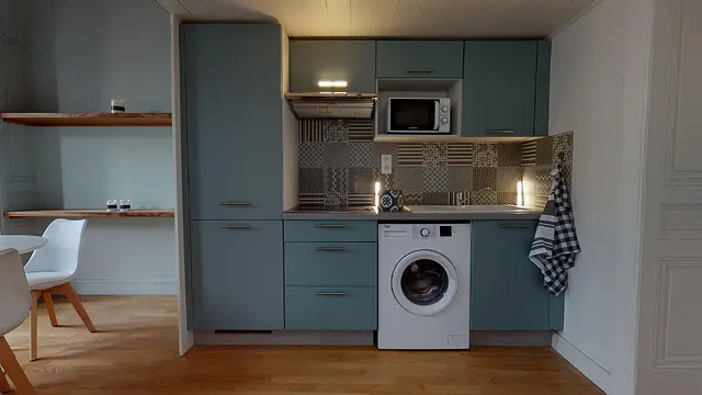 Le coin cuisine est lui aussi bien équipé : plaques de cuisson, micro-onde, et machine à laver. De nombreux espaces de rangement sont là aussi disponibles.
