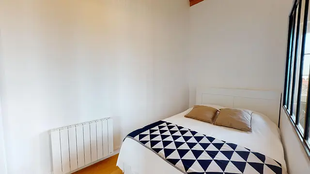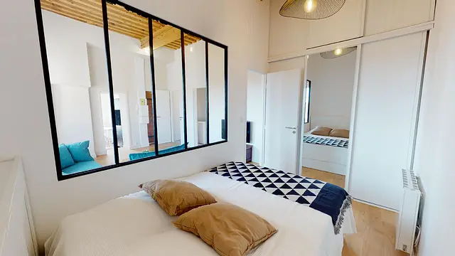 La chambre est lumineuse grâce à l’ingénieuse verrière qui laisse entrer la lumière du salon. On trouve un lit deux places et un grand placard mural avec portes coulissantes miroir et de non moins grands espaces de rangements au-dessus. On notera les rangements astucieux, faisant office de table de nuit, glissés dans la tête de lit.