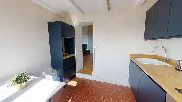 L’appartement se compose d’un séjour, d’une chambre, d’une cuisine, d’une salle de bain et des toilettes, indépendantes. Il propose un ameublement intelligent, sobre et élégant. Le charme conjoint de la verrière, entre la chambre et le salon, et du plafond à la française lui donne un cachet fou.