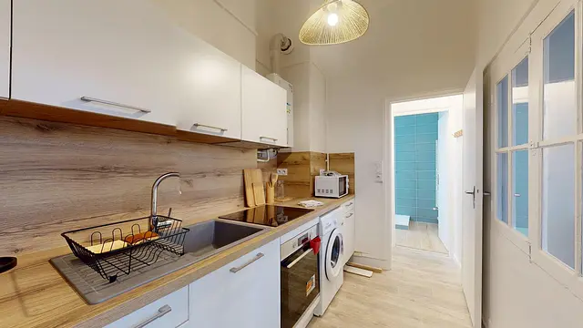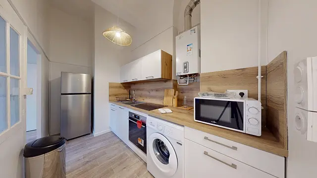 La cuisine indépendante est entièrement équipée avec des plaques de cuisson, un four, un micro-ondes, un réfrigérateur et un lave-linge pour votre plus grand confort.