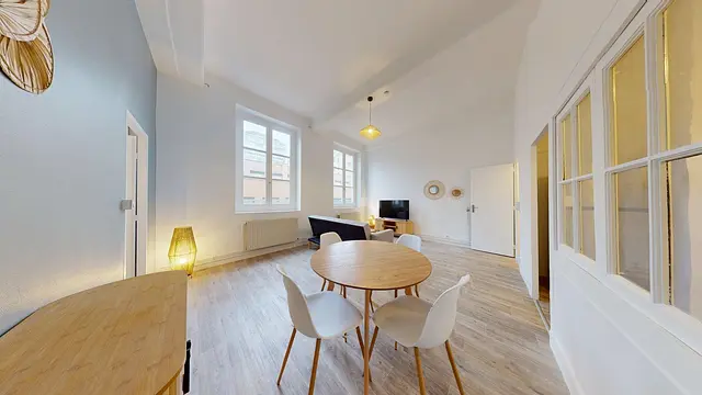 Ce logement de charme au cachet historique se compose d'une pièce de vie lumineuse comprenant un espace salon avec canapé et télévision ainsi qu'un coin salle à manger.