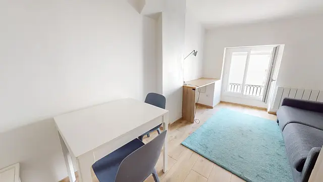 L'appartement s'ouvre sur une pièce de vie avec cuisine ouverte. Celle-ci dispose d'un canapé convertible, d'un meuble de rangement, d'un bureau et d'une table avec 2 chaises.