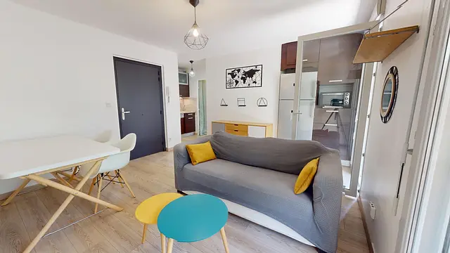 Le T2 s'ouvre sur une belle pièce de vie lumineuse et ouverte sur l'extérieur. Vous aurez alors accès par une baie vitrée à un jardin, ainsi qu'une terrasse aménagée avec table à manger. La pièce principale est meublée avec table à manger, canapé, télévision écran plat, tables basses gigognes.