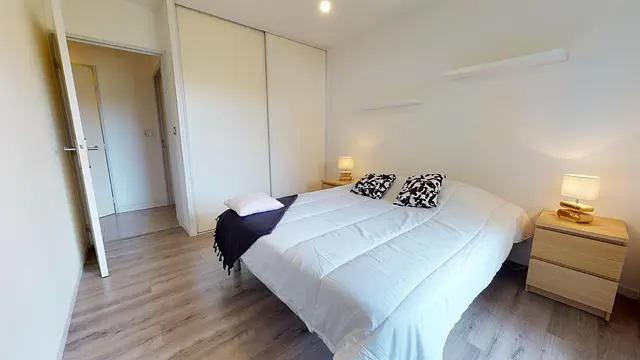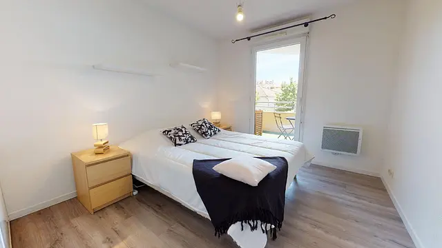 La chambre de 10m2 est séparée et aménagée avec un lit double, des tables basses et un placard intégré. La fenêtre de la chambre donne également accès au balcon présent dans le salon.