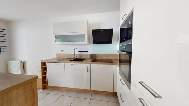 La cuisine dispose d'un bar avec deux chaises hautes, un four, une plaque de cuisson, une hotte, un micro-ondes ainsi que de nombreux rangements.