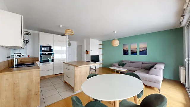 Un séjour avec une table à manger ainsi que quatre chaises. Le salon comprend un grand canapé d'angle avec une table basse ainsi qu'une télévision murale. Ces espaces donnent accès à une grande terrasse avec une table et des chaises.