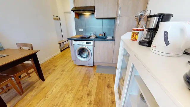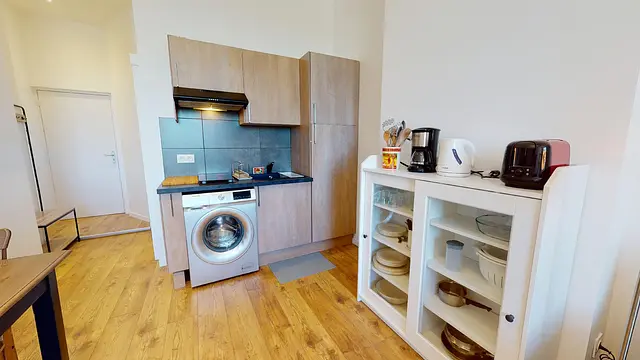 La cuisine est équipée avec une machine à laver, des plaques de cuisson, un frigo, une hotte, une machine à café, une bouilloire, de la vaisselle, des rangements, etc.